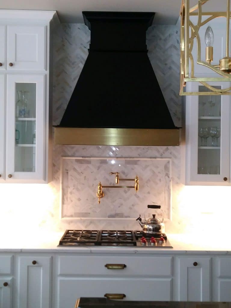 This angled black custom hood adds a bold, modern statement to the kitchen. The sleek lines and deep black finish create a striking contrast against surrounding cabinetry, while the brass band along the bottom adds a touch of warmth and sophistication. The combination of contemporary design and elegant detailing makes this piece a true focal point, blending style and craftsmanship seamlessly.