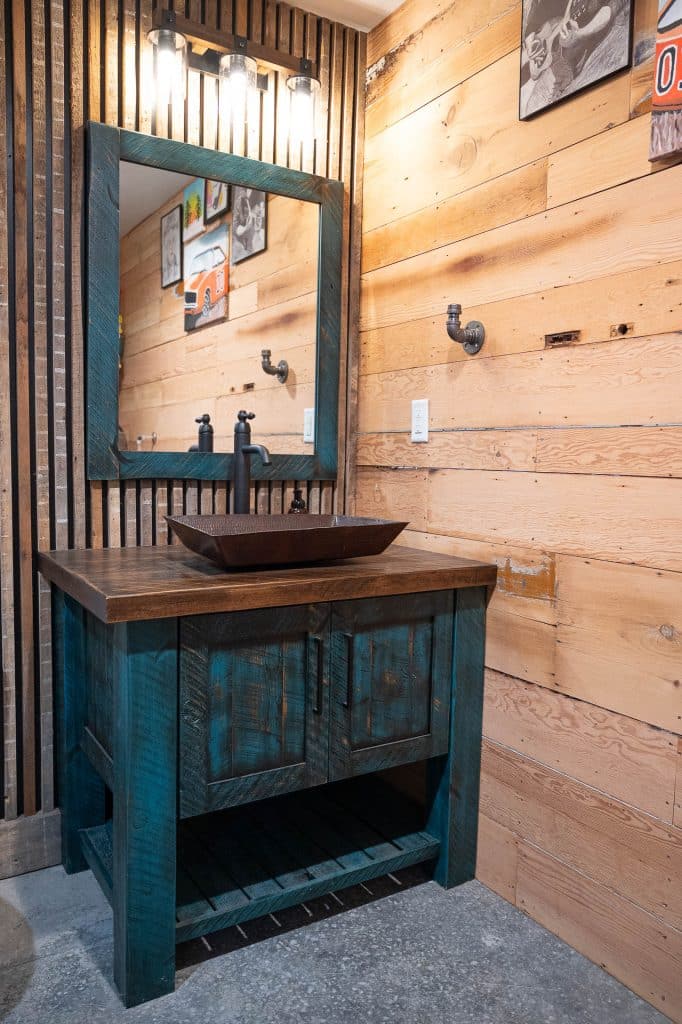 Creates warm, character-rich bathrooms using materials from Forever Barnwood. Made from new lumber, these cabinets deliver an authentic barnwood appearance without the impurities of reclaimed materials. Full overlay doors and rustic solid wood tops establish inviting, organic aesthetics.