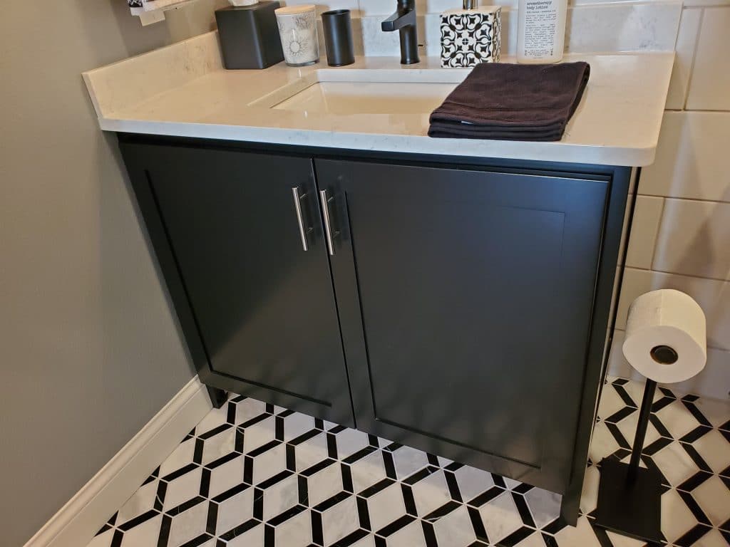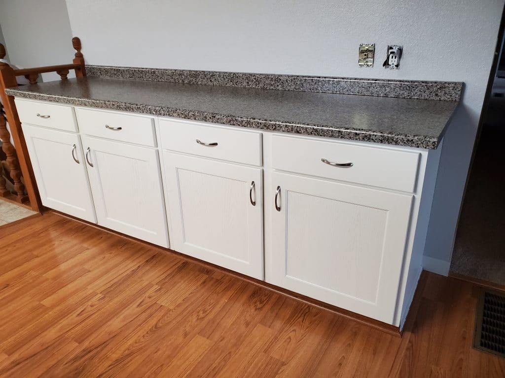 This clean and inviting design features pure white paint applied to oak cabinetry, allowing the subtle wood grain to add natural depth beneath the crisp finish. The shaker-style doors bring timeless simplicity and craftsmanship to the space, creating a look that feels both classic and versatile. A durable laminate countertop completes the design, offering an […]