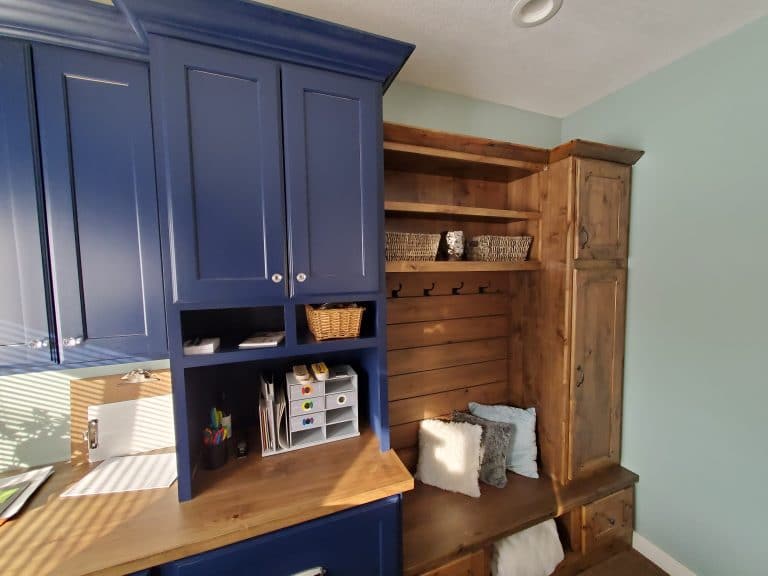 This space showcases painted blue cabinets that bring a bold yet calming personality to the room. The raised panel doors