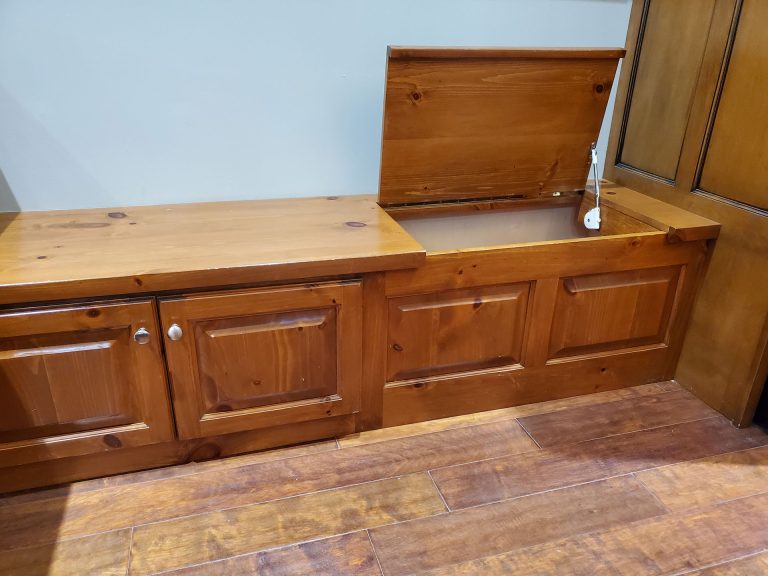 This charming bench, crafted from knotty pine, combines rustic warmth with everyday functionality. Designed with both front storage and a