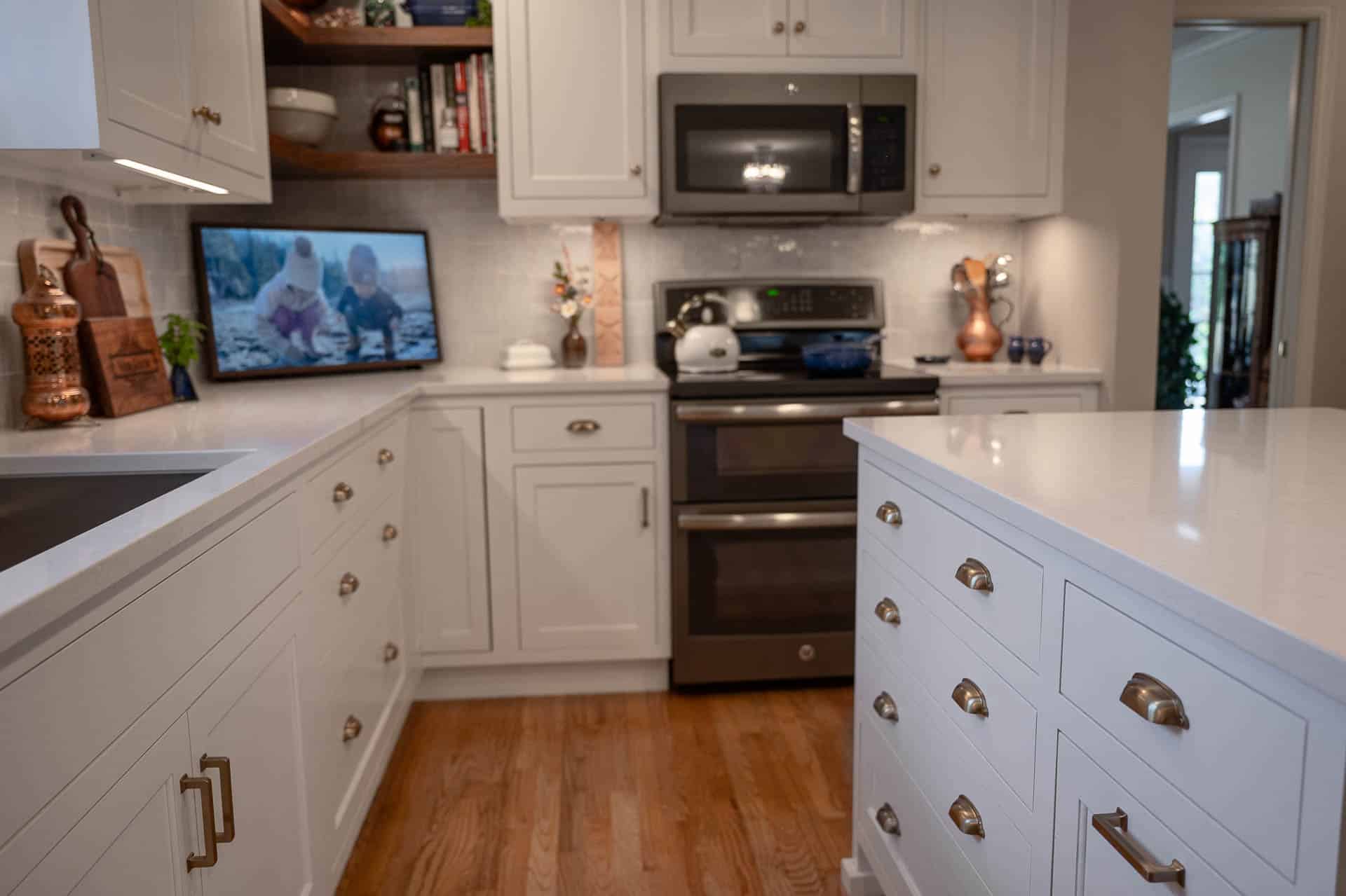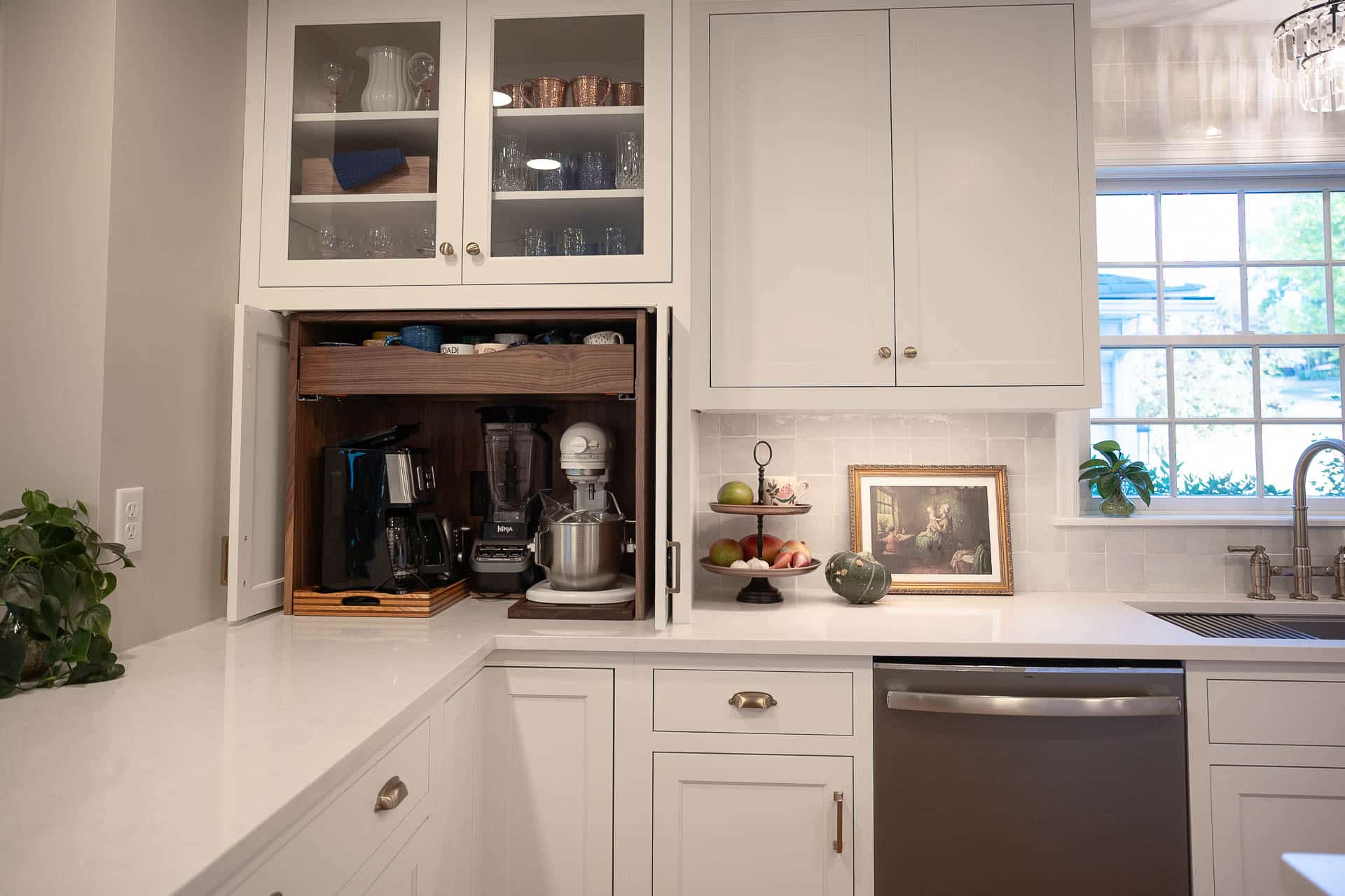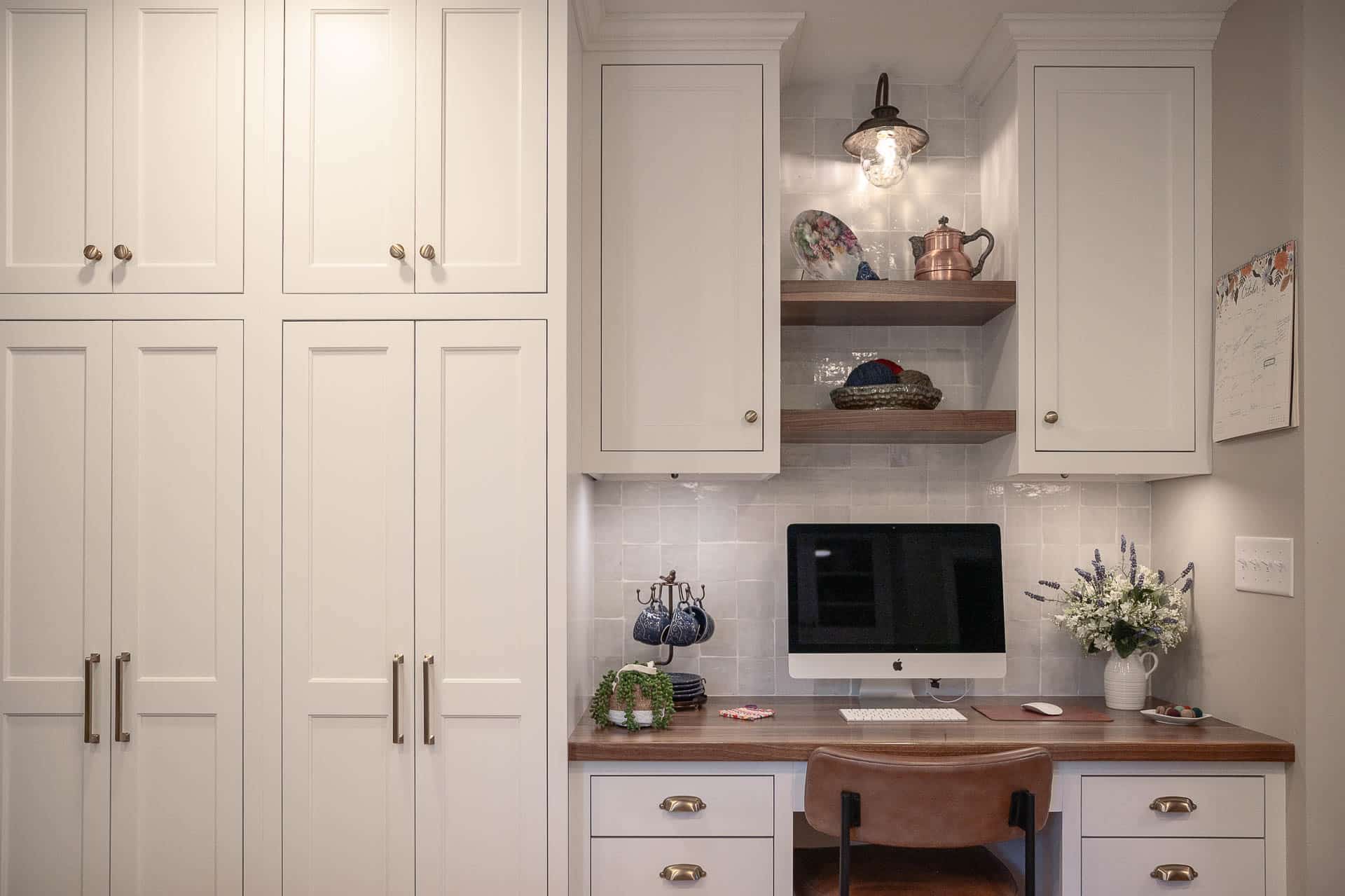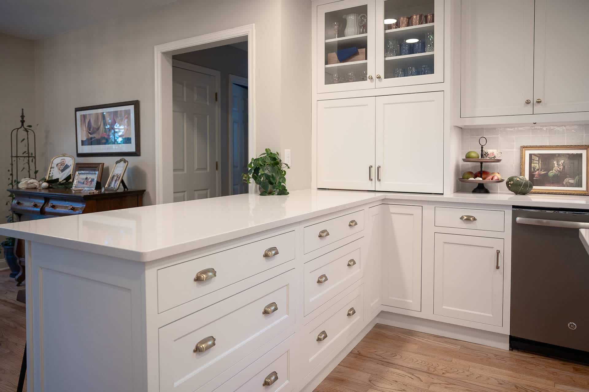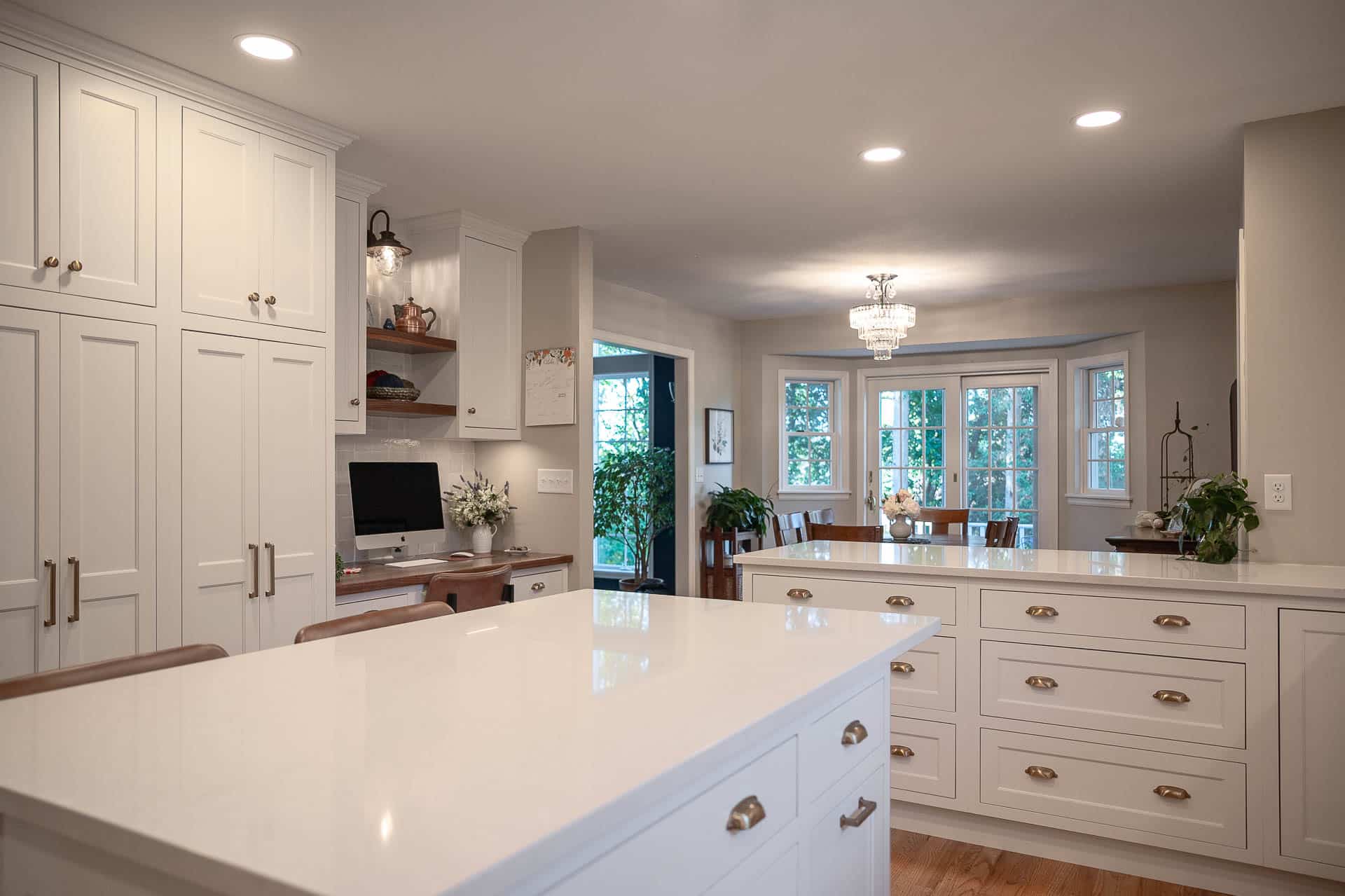 This bright and elegant kitchen features pure white cabinetry with inset Concord doors that bring a timeless, tailored look. Smooth quartz countertops add a touch of sophistication, while natural-finished walnut accents on the floating shelves and desktop introduce warmth and texture. Smart design elements like corner Susans, pocket doors, and glass-front cabinets enhance both function and style, creating a space that feels open, organized, and beautifully refined.