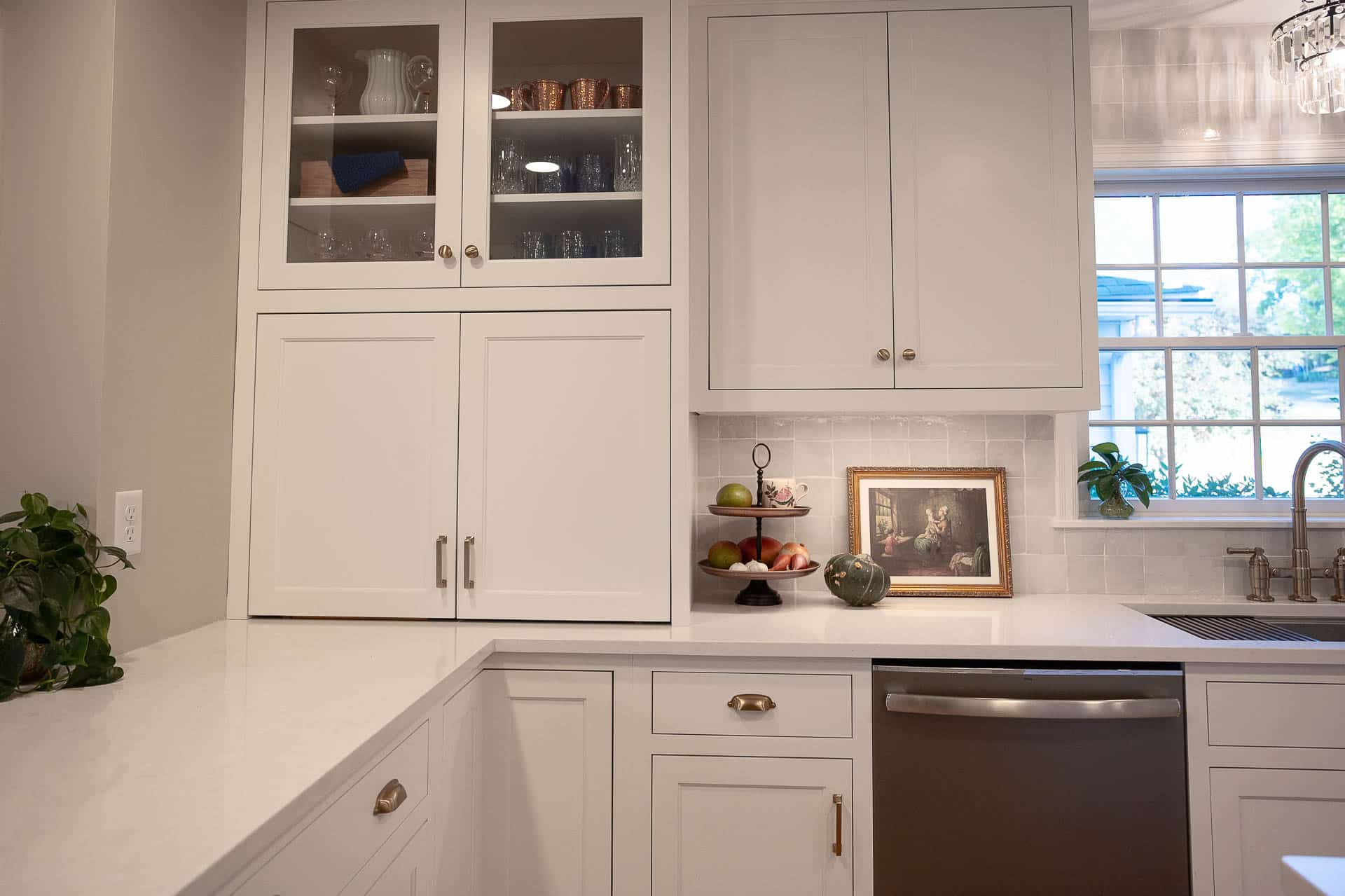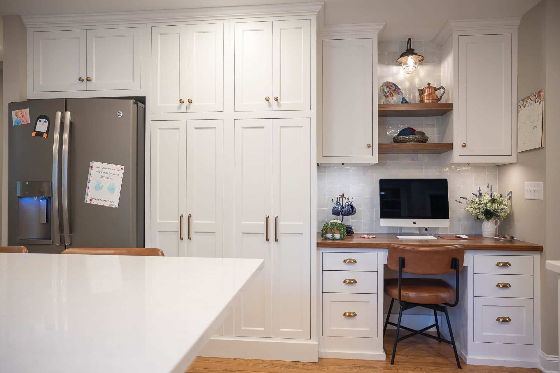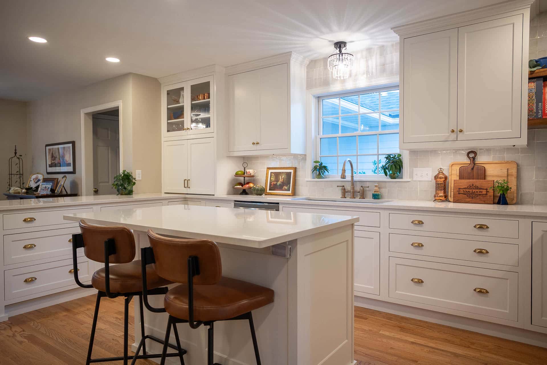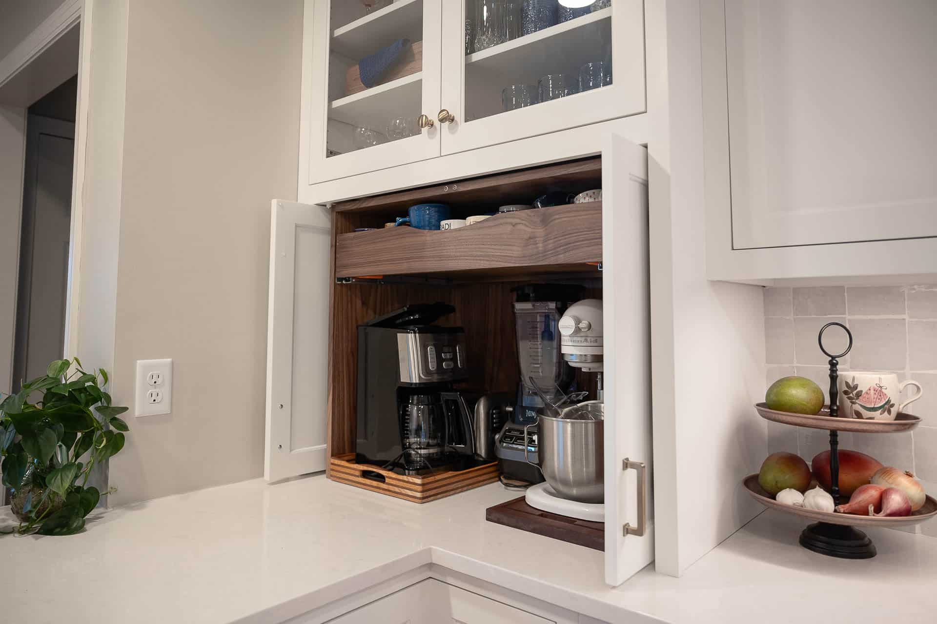 This bright and elegant kitchen features pure white cabinetry with inset Concord doors that bring a timeless, tailored look. Smooth quartz countertops add a touch of sophistication, while natural-finished walnut accents on the floating shelves and desktop introduce warmth and texture. Smart design elements like corner Susans, pocket doors, and glass-front cabinets enhance both function and style, creating a space that feels open, organized, and beautifully refined.