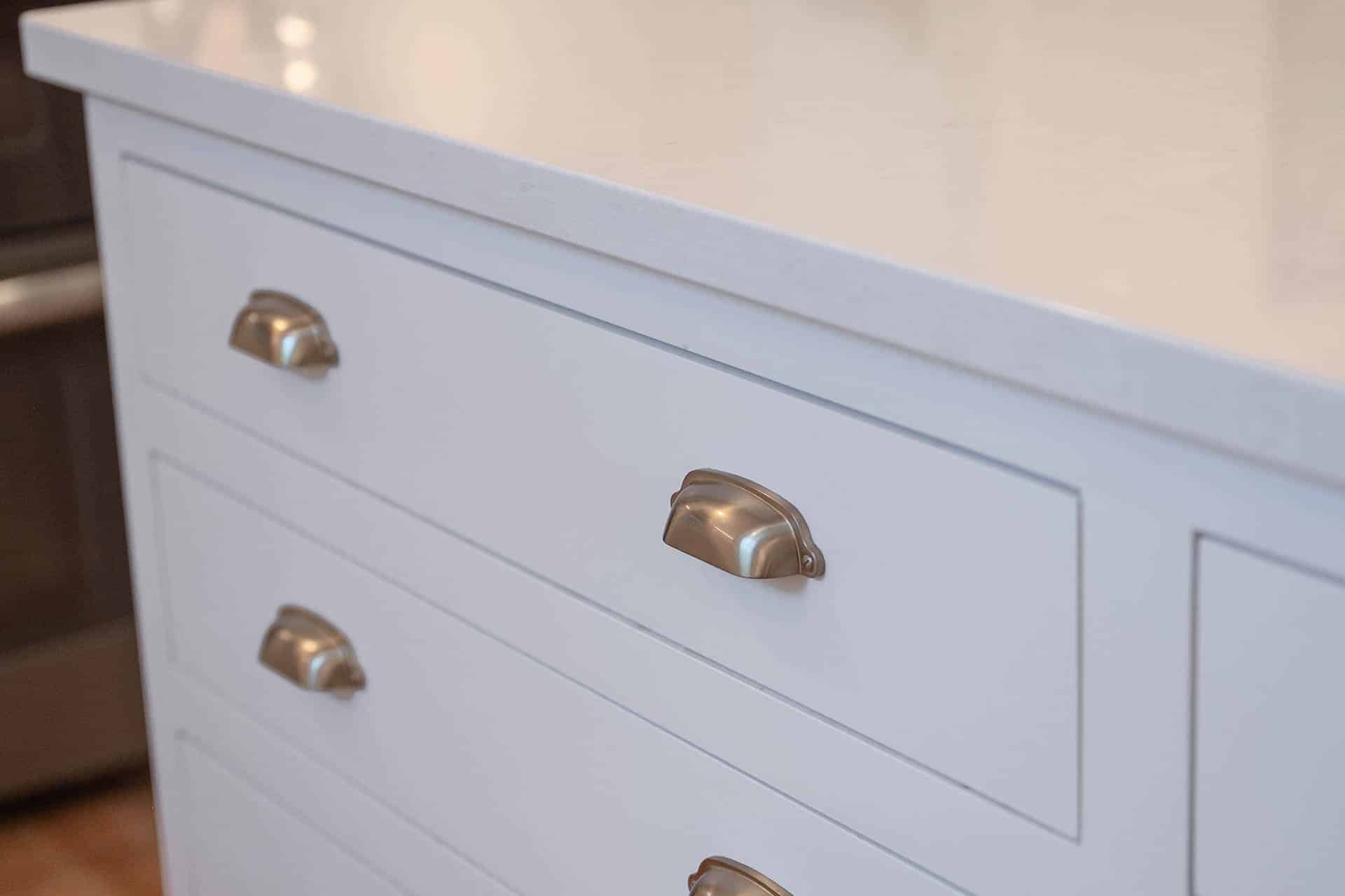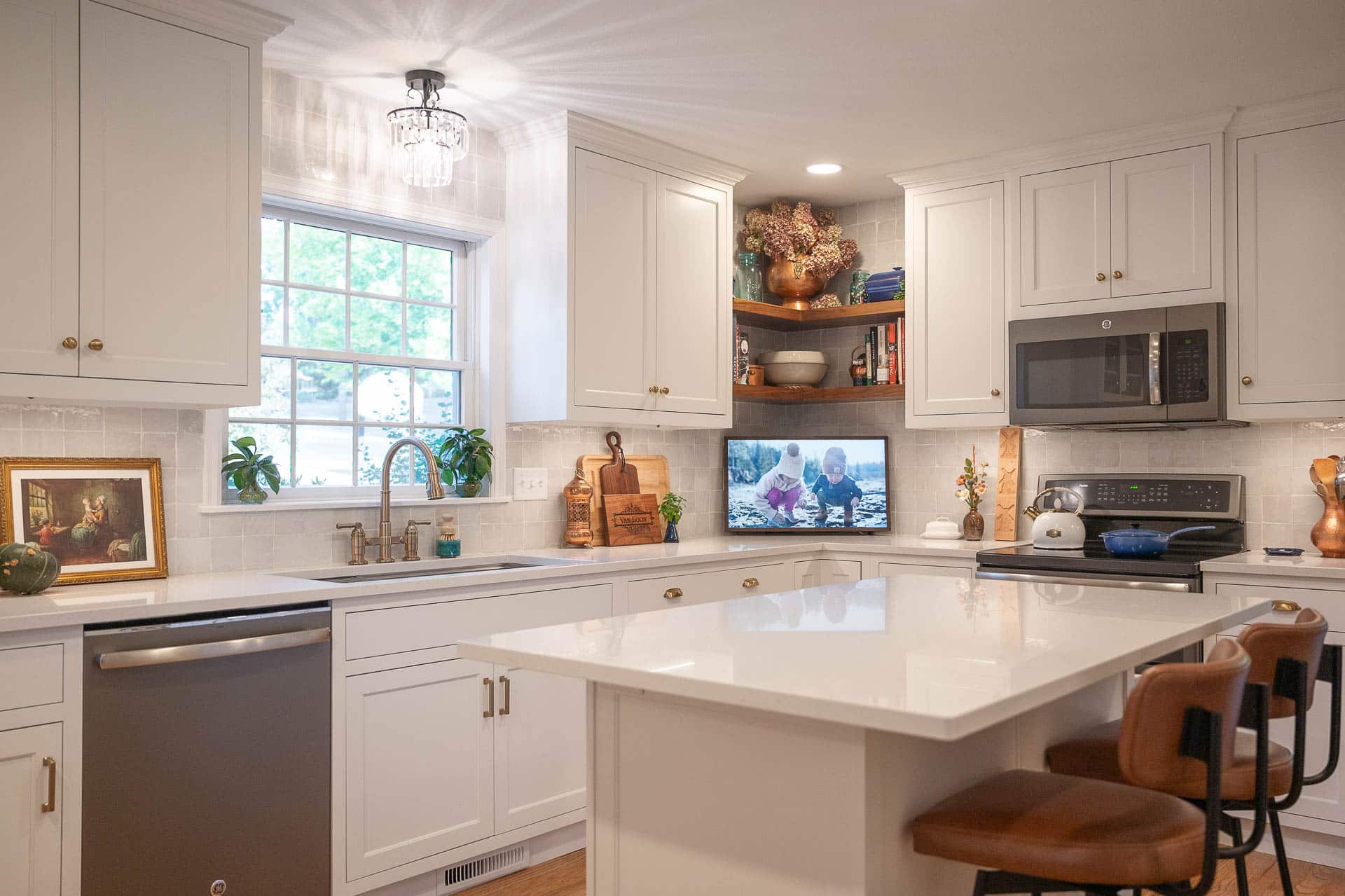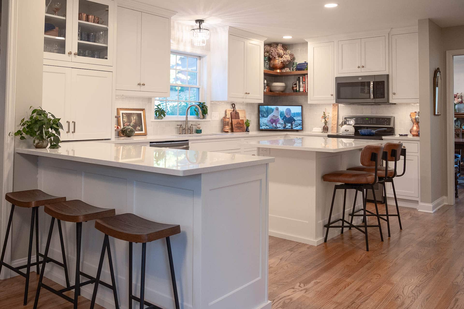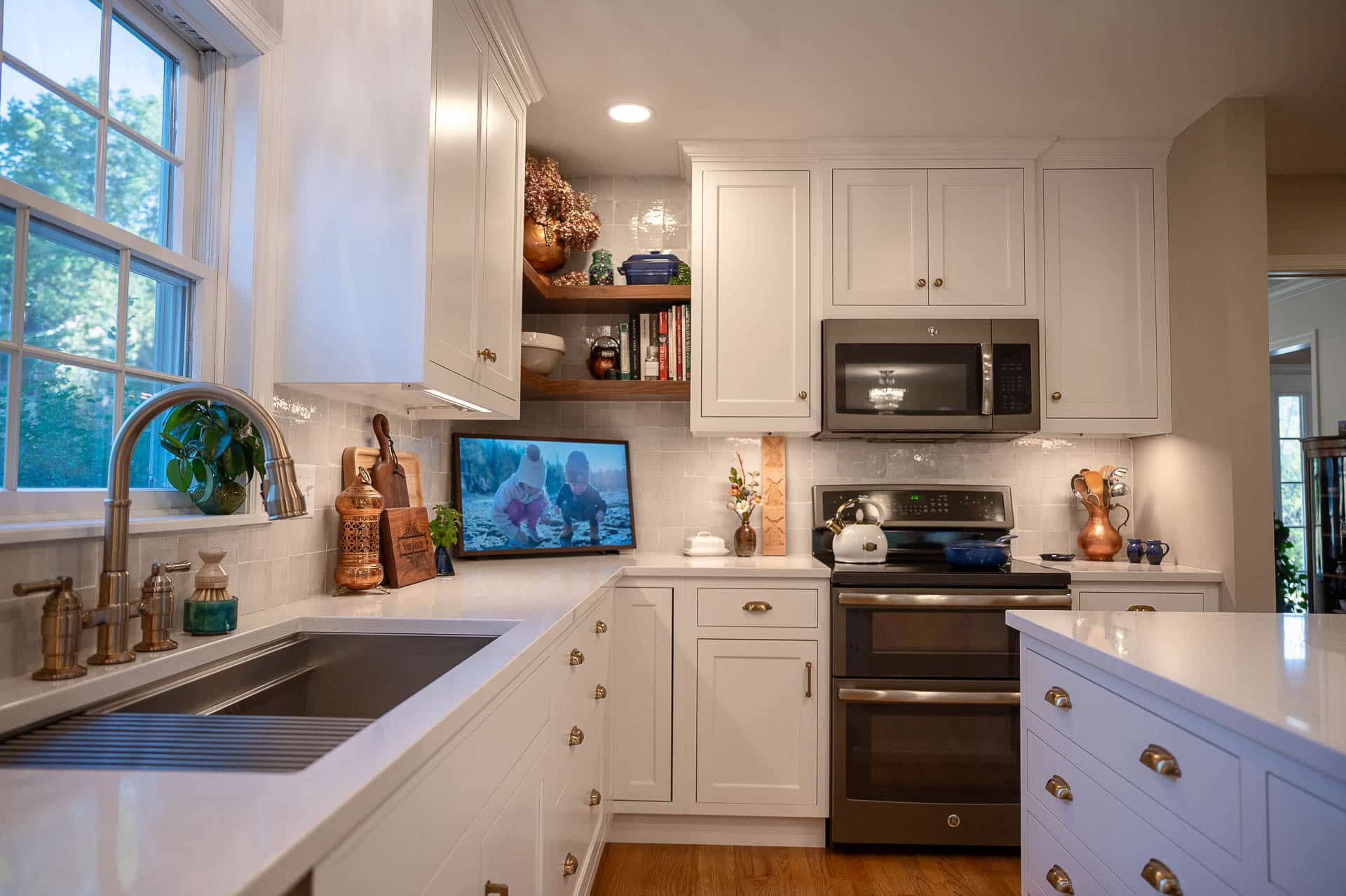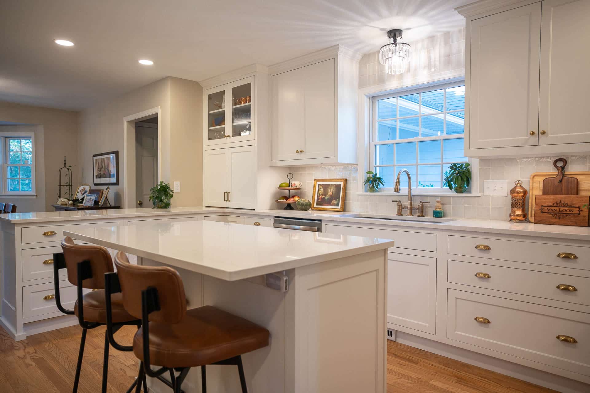 This bright and elegant kitchen features pure white cabinetry with inset Concord doors that bring a timeless, tailored look. Smooth quartz countertops add a touch of sophistication, while natural-finished walnut accents on the floating shelves and desktop introduce warmth and texture. Smart design elements like corner Susans, pocket doors, and glass-front cabinets enhance both function and style, creating a space that feels open, organized, and beautifully refined.